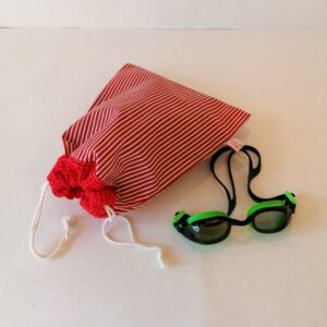 Le sac étanche se ferme au moyen de  liens coulissants comme les filets à fruits et légumes. Le haut du sac est d’ailleurs réalisé dans un autre tissu, plus souple afin que le sac se ferme parfaitement bien. J’utilise du tissu recyclé, ou du nid d’abeille, très absorbant. C’est pour cette raison qu’il peut y avoir de toutes petites variations dans les sacs.