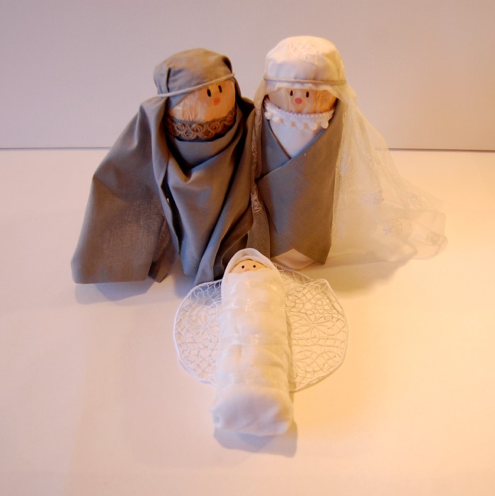 C’est une crèche de Noël ludique qui plaira autant aux grands qu’aux petits. J’ai peint des visages enfantins et habillé mes personnages avec des tissus choisis dans une gamme neutre. Ces personnages sont particuliers car ce sont des bâtons de pluie: chacun d’entre eux est rempli de graines de différentes tailles. Ainsi ils produisent tous un son différent lorsqu’on les manipule. Marie a un son feutré tandis que les Rois Mages ont un son plus marqué, seul Jésus ne fait pas de bruit.