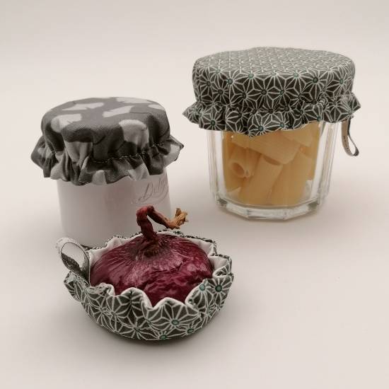 Vous connaissez certainement les charlottes couvre plats? Et bien voici les mêmes en plus petit! Non, en fait, ce n’est pas tout à fait vrai. Les mini charlottes ne sont pas fabriquées de la même manière que les charlottes couvre plats. Elles sont doublées de PUL car elles n’ont pas la même destination que les plus grandes. Ainsi, vous évitez d’utiliser à tout va du film alimentaire qui est un produit à usage unique. Je vous défie de l’utiliser une deuxième fois. Le souci est le même avec le papier aluminium qu’on ne peut utiliser qu’une seule fois. Le déchet qu’il produit est juste un peu moins pire. Il reste alors la solution de l’assiette ou la coupelle posée sur le petit contenant (pas très pratique) mais qui ne fonctionne pas dans le cas des demi fruits et légumes entamés.