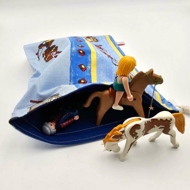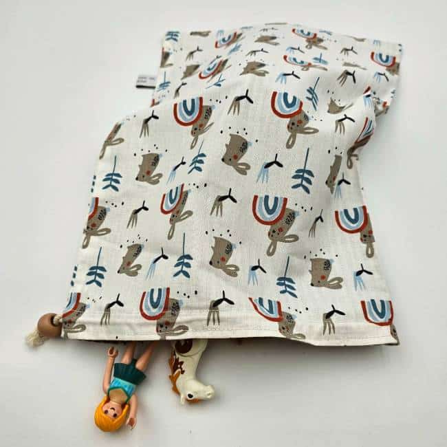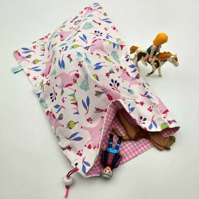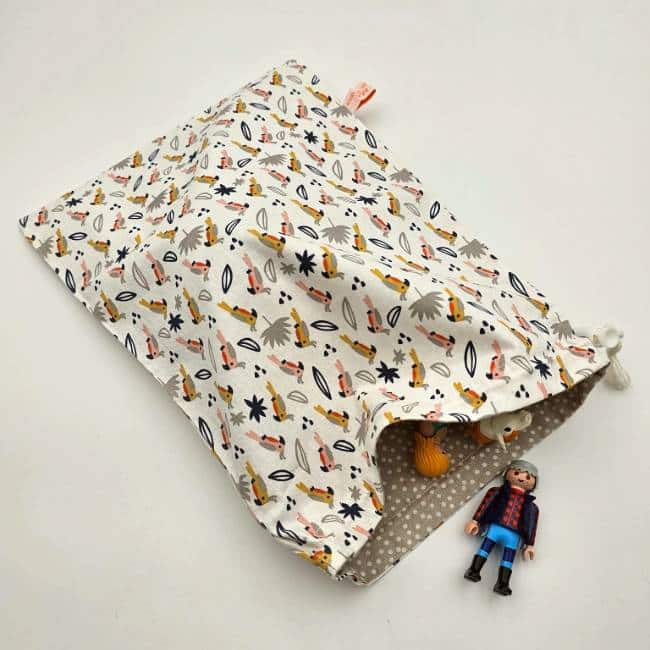 On s’en sert pour mettre un pyjama et une brosse à dent avant de partir pour une nuit, pour mettre nos sous-vêtements quand on part en vacances, pour ranger une tablette, un livre, des crayons et un bloc note, les playmobil, les câbles d’ordinateur, les trucs qui trainent tout le temps car on sait pas où les ranger… Et chacune d’entre elles seront définies et reconnaissables à leur tissu. une pochette avec des nageuses pour ranger les lunettes de piscine, une pochette neutre pour ranger toutes les clés USB, cartes SD et ainsi de suite.