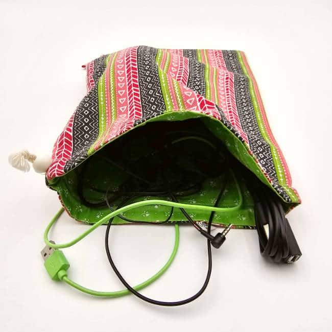 La première fois que j’en ai cousu une c’était pour ma cadette pour partir en voyage de classe au ski. Cette pochette de rangement en tissu lui a permis d’avoir tout sous la main: câble d’appareil photo et d’Ipod, appareil photo et Ipod, un livre de poche, un petit jeu pour jouer entre copines dans le bus, un mouchoir en tissu, un petit carnet et quelques crayons. Elle en était tellement contente qu’elle l’a montrée à toutes ses copines qui en voulaient aussi et elle l’utilise à chaque fois qu’elle part pour quelques jours.
